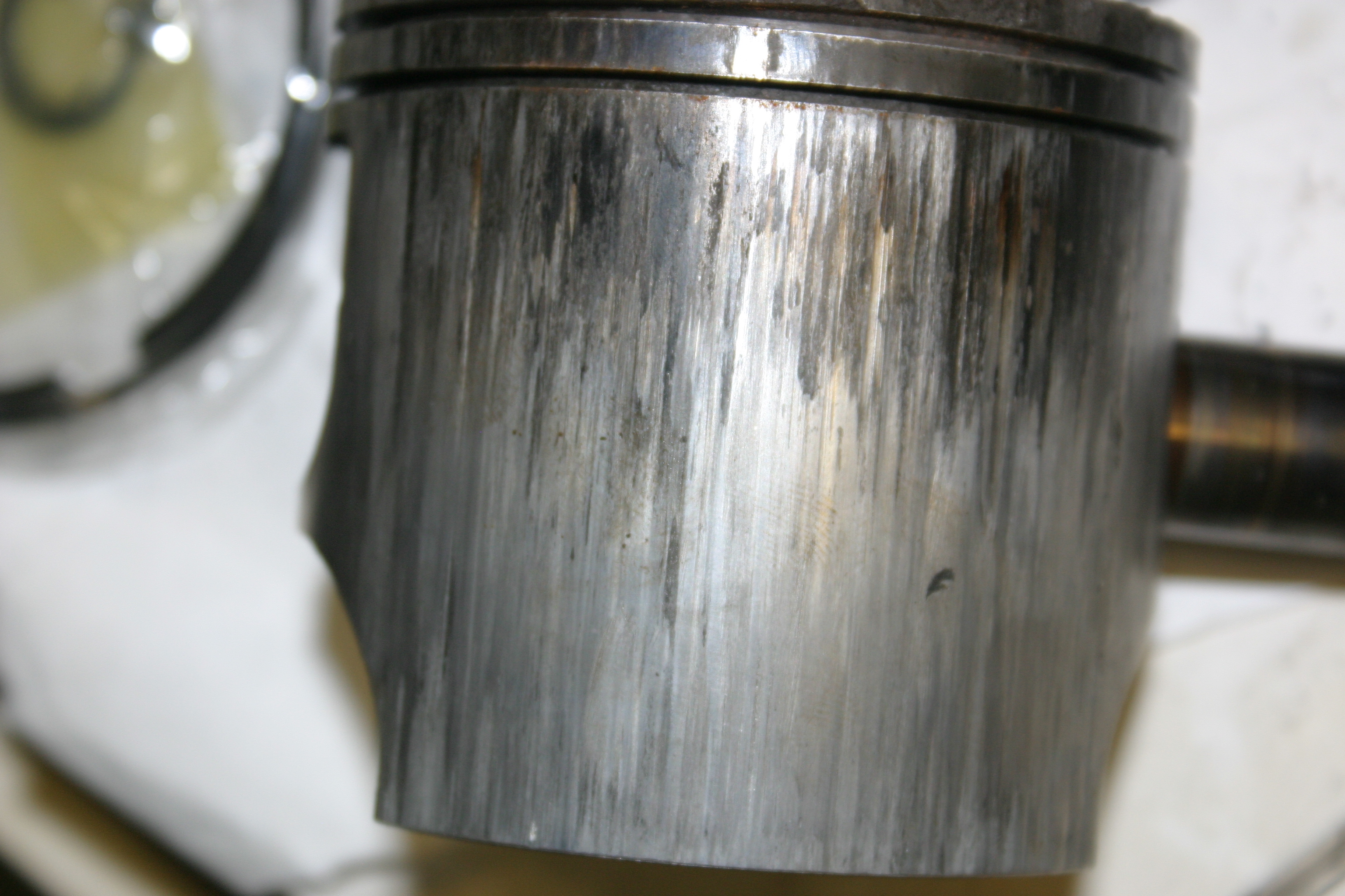 Two years ago my ski started running really bad on a multi-day trip to the lake. The first sign of any trouble was one morning when I got up early to ride. It was very calm and I must have run it for about 30 minutes wide open. While at full speed the motor suddenly bogged real hard and died. I cranked it and it took off again. It did crank a little slow like it was real tight so I was thinking it might have seized. After that it would run at mid RPM but bog and die at higher RPM. Idle was very rough. I looked it all over, pulled the RAVE valves to clean them thinking one might be stuck. That's when I noticed that the PTO piston was missing a small chunk right at the RAVE / exhaust port. Now there is some history here. I purchased the Sea-Doo from a girl that popped a hole in the hull and sank it with only 20 hours. I noticed all along that it had very noticeable scars on the PTO piston when viewed from the RAVE opening. I guessed water ingestion either when she sank it or at some other time. But otherwise it ran fine (65 MPH) in between major problems. I'm certain that one of the major problems, probably the air leak, caused the final destruction of the piston. This is a problem history:- Jet pump oil filler cross threaded causing a small oil leak - Had to replace the jet pump bearing cover