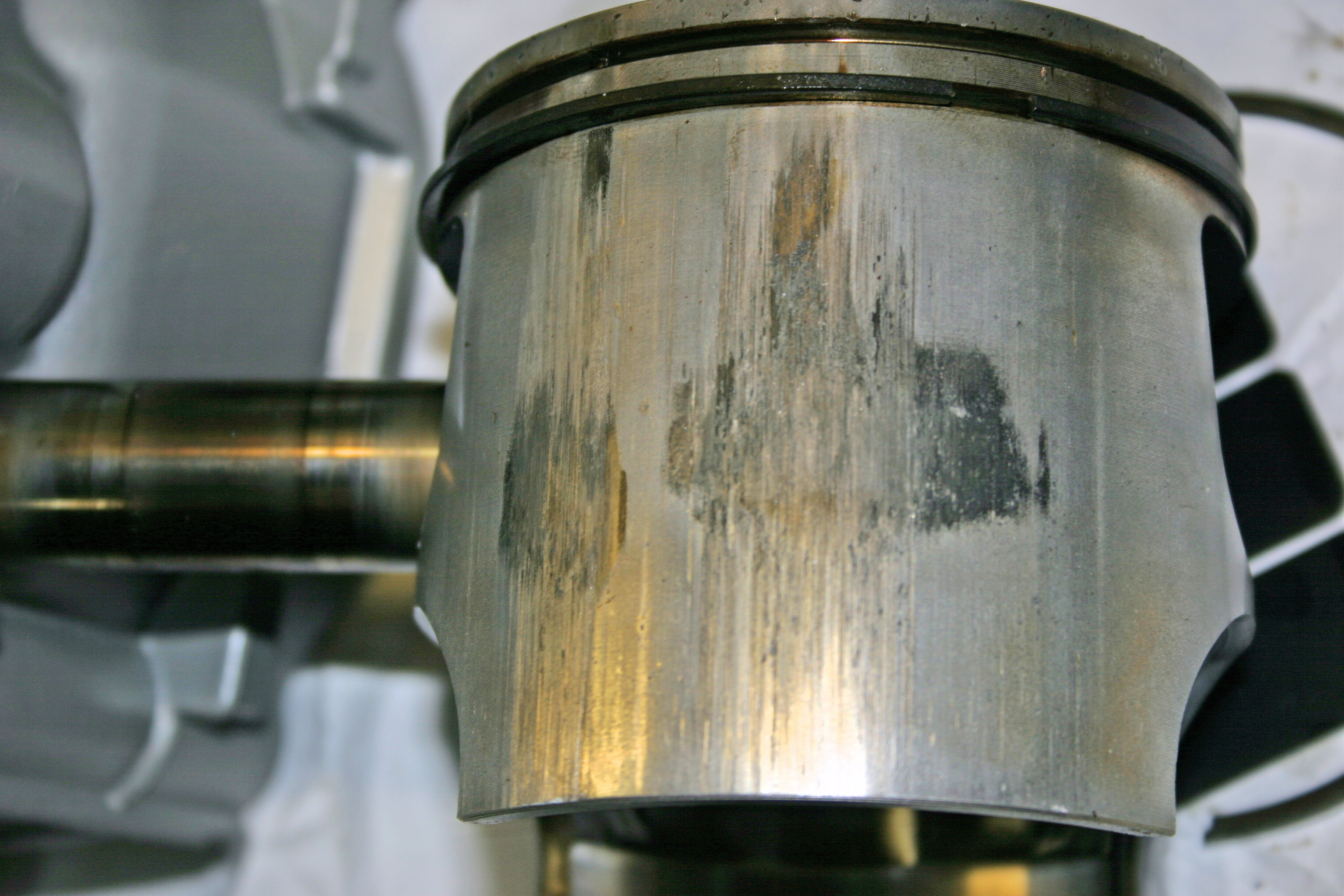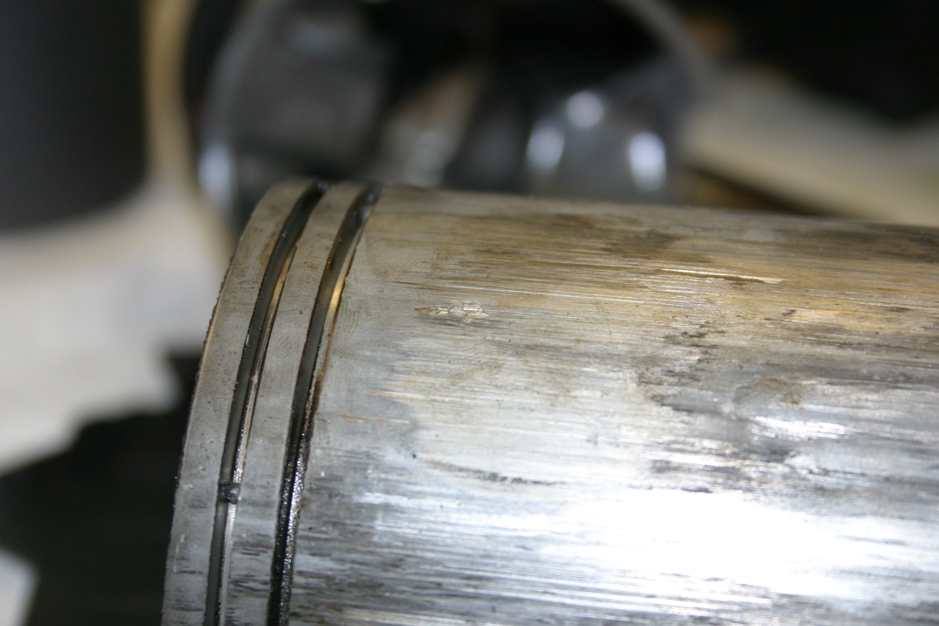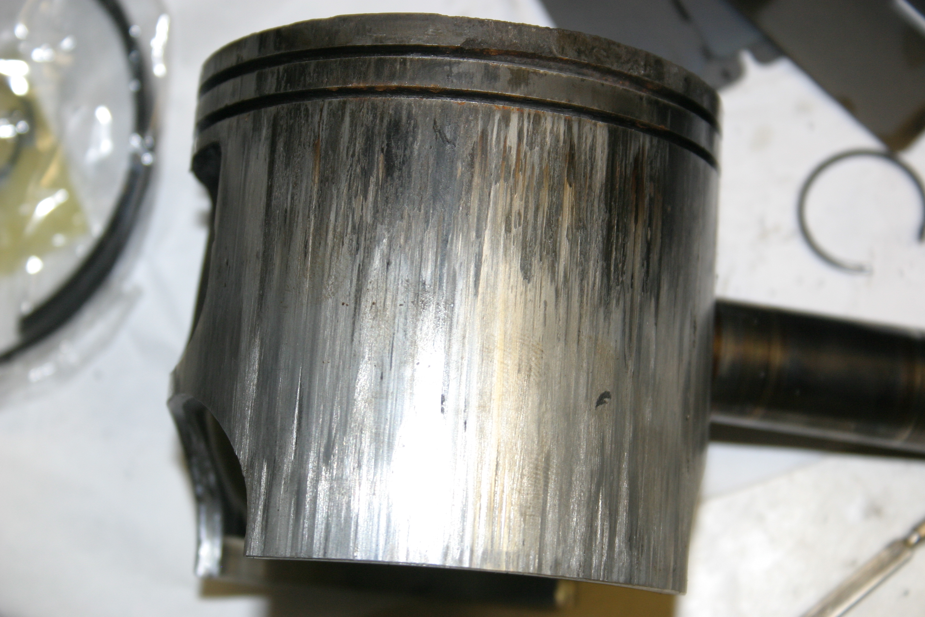 Two years ago my ski started running really bad on a multi-day trip to the lake. The first sign of any trouble was one morning when I got up early to ride. It was very calm and I must have run it for about 30 minutes wide open. While at full speed the motor suddenly bogged real hard and died. I cranked it and it took off again. It did crank a little slow like it was real tight so I was thinking it might have seized. After that it would run at mid RPM but bog and die at higher RPM. Idle was very rough. I looked it all over, pulled the RAVE valves to clean them thinking one might be stuck. That's when I noticed that the PTO piston was missing a small chunk right at the RAVE / exhaust port. Now there is some history here. I purchased the Sea-Doo from a girl that popped a hole in the hull and sank it with only 20 hours. I noticed all along that it had very noticeable scars on the PTO piston when viewed from the RAVE opening. I guessed water ingestion either when she sank it or at some other time. But otherwise it ran fine (65 MPH) in between major problems. I'm certain that one of the major problems, probably the air leak, caused the final destruction of the piston. This is a problem history:- Jet pump oil filler cross threaded causing a small oil leak - Had to replace the jet pump bearing cover